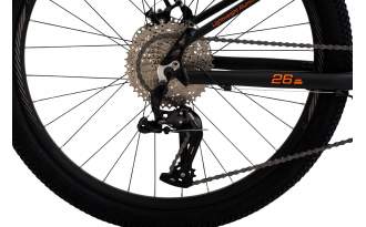 Los frenos de disco mecánico y las palancas Logan de aluminio garantizan un frenado confiable incluso en condiciones húmedas o terrenos irregulares, mientras que las ruedas de 26" con cubiertas 26 x 2.35/TUBE AV aportan estabilidad, tracción y confianza.
