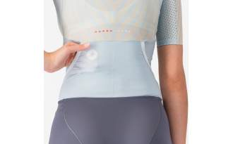 El traje incorpora un bolsillo interior para hielo en el cuello, ideal para mantener la temperatura corporal en condiciones de calor extremo. Además, los dos bolsillos traseros planos permiten transportar geles o alimentos sin que estos reboten, asegurando máxima eficiencia durante el recorrido. La abertura frontal Sanremo facilita tanto la flexión en la bicicleta como el enderezamiento para la carrera a pie o la natación, además de ofrecer ventilación adicional en días calurosos.